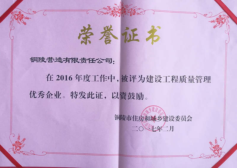 銅陵?duì)I造有限責(zé)任公司是國(guó)家住建部核準(zhǔn)的房屋建筑總承包一級(jí)企業(yè)。2006年7月,企業(yè)二次改制為民營(yíng)企業(yè),并更名為“銅陵?duì)I造有限責(zé)任公司”。目前,公司擁有房建施工總承包、市政公用工程總承包、鋼結(jié)構(gòu)專業(yè)工程承包、建筑裝修裝飾專業(yè)工程承包四項(xiàng)壹級(jí)資質(zhì),機(jī)電安裝、起重設(shè)備安裝、建筑幕墻三項(xiàng)貳級(jí)資質(zhì),地基與基礎(chǔ)一項(xiàng)叁級(jí)資質(zhì)。2008年通過(guò)北京恩格威ISO9001、ISO14001和OHSAS18001“三合一”體系認(rèn)證。